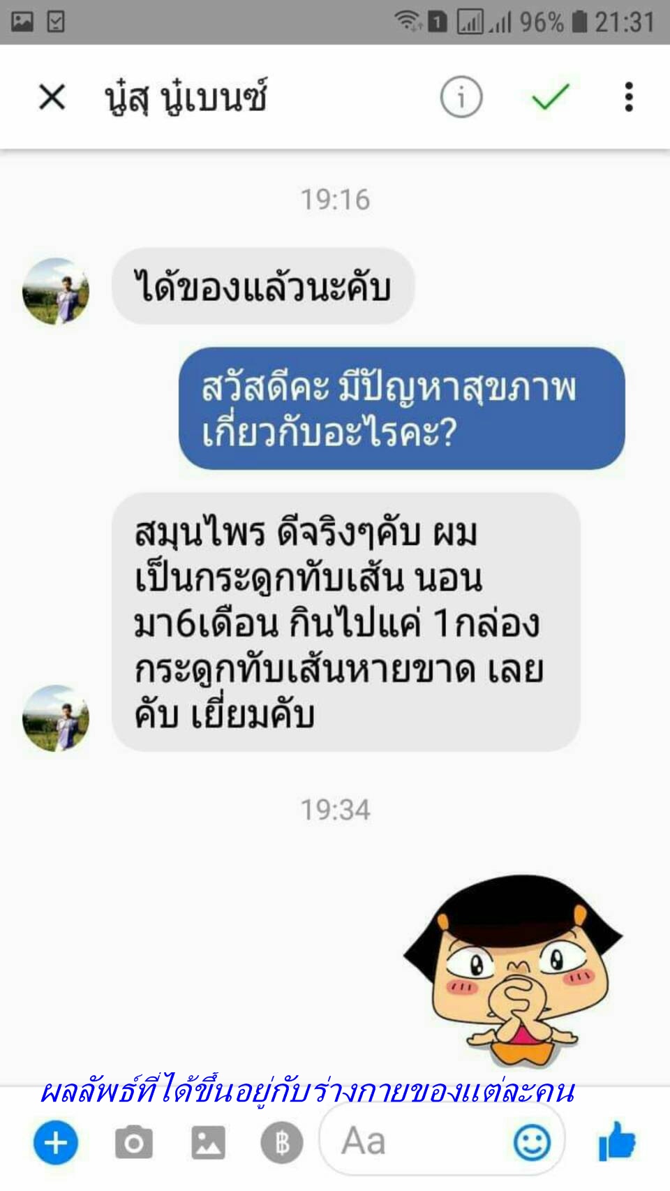 ต้องใช้ไม้ 4 ขา ช่วยพยุงเดินตอนนี้ขับรถยนต์ ได้แล้ว เดินได้ปกติ ดิฉันเป็นโรคกระดูกเสื่อม หมอเขาทำ MRI พบว่ามวลกระดูกติด ลบ 4 รักษามาเกือบปีไปโรงพยาบาลเอกชน มาหลายที่และทานมุนไพรอื่นๆหมดเงินกว่า 3-4 แสน ที่ไหนว่าดีไปหมด จนต้องขายบ้านเพื่อรักษาสุขภาพของตัวเอง ต้องไปฉีดยาทุกเดือน เข็มละหมื่นกว่าตอนแรกที่ทางศูนย์ฯแนะนำก็ไม่เชื่อ เอาข้อมูลไปปรึกษาหมอแต่พอผ่านไปเดือนกว่าอาการยังไม่ดีขึ้นเลยลองซื้อมาทานดู ทานไปประมาณ 1 แผงก็รู้สึกดีขึ้นลุกจากที่นอนได้ ไม่ปวดตามเนื้อตัว พอทานหมด 3 แผงเริ่มเดินได้เลยคะดีจริงๆ ตอนนี้ทำงานได้แล้ว ชีวิตดีขึ้น เลยซื้อมาทานเพื่อบำรุง กระดูก เส้นเอ็น ร่างกายให้แข็งแรงเดือนละกล่อง อยากให้คนที่มีปัญหาสุขภาพลองเปิดใจทานดูนะคะสุขภาพแข็งแรง ดีกว่าถูกรางวัลที่ 1 เลยนะคะ