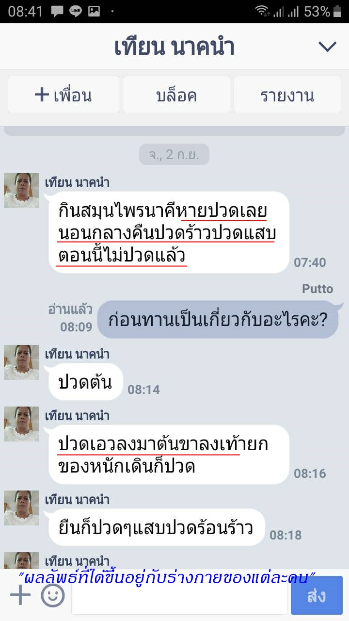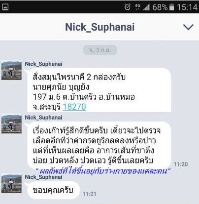 เกี่ยวกับเลือดก็ดีขึ้น ผมเลยให้พี่ชายของผมลองกินดูบ้าง พี่ชายผมเดินไม่ค่อยได้ มีอาการอ่อนล้า แต่ปัจจุบันนี้พี่ชายของผมมีอาการปกติแล้ว วันๆอยู่แต่หลังบ้านถางหญ้าแทบทุกวัน