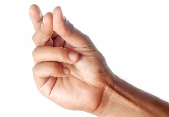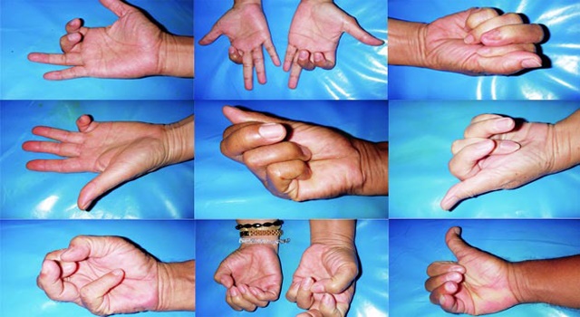 ไม่สามารถเหยียดนิ้วออกเองได้ต้องใช้มืออีกข้างหนึ่ง