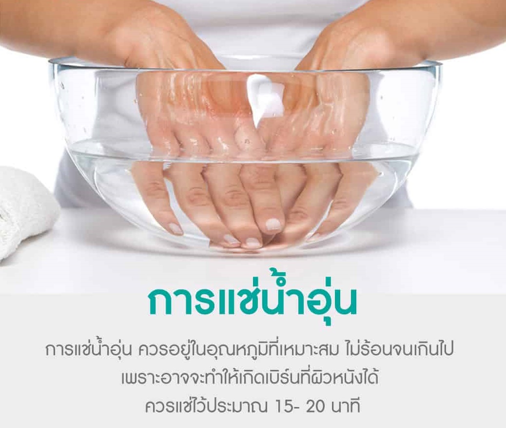 ให้แช่น้ำอุ่นร่วมกับการขยับมือ กำ-แบ ๆ
